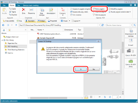 Fare clic su [Estrai pagine] nella scheda [Home] e fare clic su [Sì] nel messaggio di conferma visualizzato. La pagina estratta viene salvata nello stesso percorso.