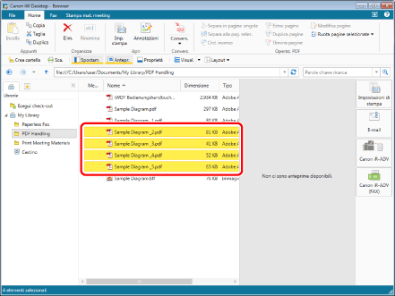 Selezionare i documenti da "Sample Diagram_2.pdf" a "Sample Diagram_5.pdf", divisi in "Divisione di un documento PDF".