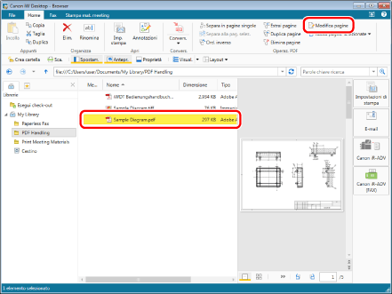 Selezionare il file "Sample Diagram.pdf" creato in "Conversione in formato PDF", quindi fare clic su [Modifica pagine] nella scheda [Home]. Viene avviata la Modalità Modifica pagine.