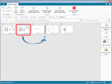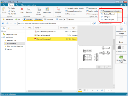 Fare clic su [Ruota pagine selezionate] nella scheda [Home] e selezionare [Sinistra 90 gradi], [180 gradi] o [Destra 90 gradi].