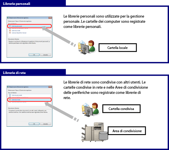Una "libreria" è una posizione in cui vengono memorizzate cartelle e documenti. Le librerie possono essere paragonate alle cassettiere degli uffici. In esse è possibile registrare cartelle presenti sui computer, cartelle condivise sulla rete e così via. La registrazione delle sole cartelle necessarie per il proprio lavoro semplifica la gestione dei dati.