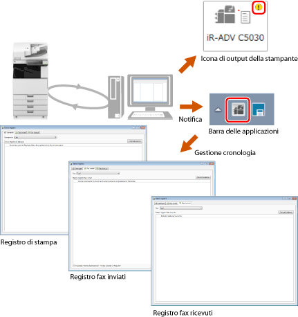 Printer Monitor consente inoltre di monitorare lo stato dei lavori di stampa e di gestire i registri di stampa e quelli relativi alla trasmissione/ricezione di fax.