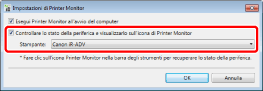 Selezionare la casella di controllo [Controllare lo stato della periferica e visualizzarlo sull'icona di Printer Monitor] e selezionare il dispositivo da monitorare in [Stampante].