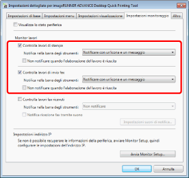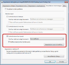 Selezionare la casella di controllo [Controlla lavori fax ricevuti] nella scheda [Impostazioni monitoraggio] e selezionare il metodo di notifica.