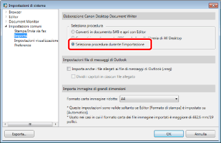 È possibile selezionare il processo Canon Desktop Document Writer nelle impostazioni della funzione [Importa] all'interno delle impostazioni di sistema. Solo quando è selezionata l'opzione [Seleziona procedura durante l'importazione] viene visualizzata una finestra di dialogo che consente di selezionare il processo.