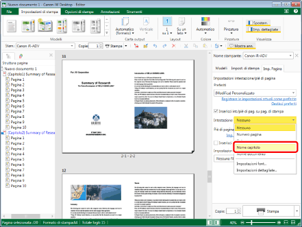 Impostare l'opzione per inserire il nome di un capitolo nell'intestazione della pagina da stampare.