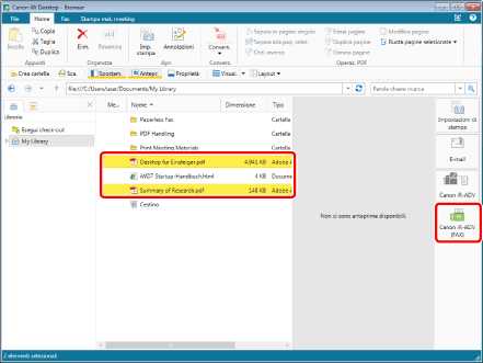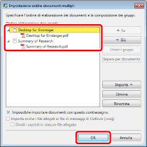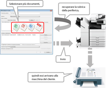 Per inviare per fax più documenti come un unico documento, impostare [Combina i documenti selezionati in uno solo con Editor per l'invio di fax] nelle impostazioni del pulsante output fax. Per informazioni sulla configurazione di queste impostazioni vedere di seguito.