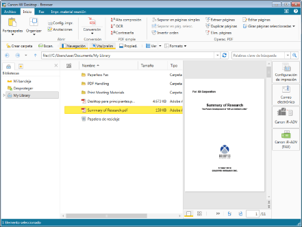 Los documentos de bibliotecas pueden imprimirse, enviarse por fax, enviarse por correo electrónico y editarse utilizando la pantalla del Desktop Browser. Como las carpetas de una biblioteca y dispositivos externos tales como imageRUNNER ADVANCE pueden monitorizarse, el estado de documentos que han sido añadidos o actualizados y el estado de dispositivos externos pueden comprobarse en la pantalla Desktop Browser.