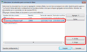 Al convertir varios documentos en un documento PDF, se añadirá un número Bates a los documentos desde el documento que aparece al comienzo de la lista.