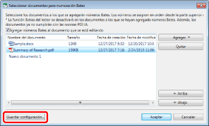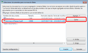 Si se selecciona [Usar el nombre de archivo original] en [Especificar nombre de archivo], el nombre del documento que aparece en la lista [Seleccionar documentos para numeración Bates] se utilizará para el documento PDF.