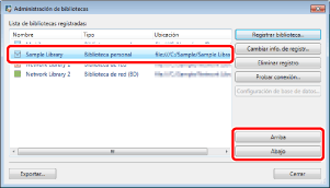 Seleccione las librerías que desea ordenar en [Lista de bibliotecas registradas] y después haga clic en [Arriba]/[Abajo].