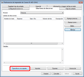 Si utiliza el Canon Generic FAX Driver, haga clic en [Editar libreta de direcciones] en la pestaña [Seleccionar destino] y en [Especificar una carpeta] en [Editar libreta de direcciones] cuando aparezca.