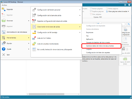 Para crear un botón de salida de [Cambiar datos de índice de documentos] desde Desktop Editor, seleccione el menú [Archivo] > [Configuración/Administración] > [Crear botón para cambiar datos de índice del documento].