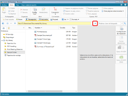Cuando se introduce una ruta de documento en la barra de direcciones, se muestra la carpeta donde está guardado el documento en la Ventana de navegación. Primero se selecciona el documento en la Ventana de visualización de la lista de archivos y luego se ejecuta la aplicación asociada con el documento y visualiza el documento.