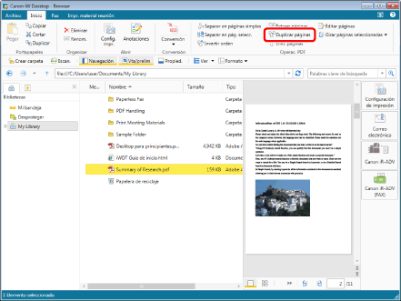 Si duplica las páginas seleccionadas de un documento PDF con un atributo como "Solo lectura" (Windows), el atributo se invalida en el documento PDF duplicado.