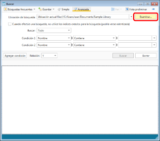 La ruta de acceso a la biblioteca o a la carpeta de objetivo de búsqueda aparece en [Ubicación de búsqueda] en la Pantalla de búsqueda.