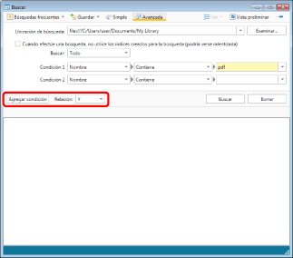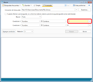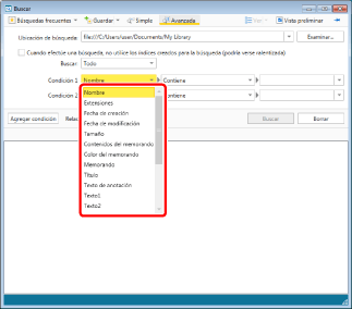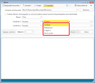 Si se selecciona [O], se mostrarán los resultados de búsqueda que incluyan cualquiera de las condiciones de búsqueda establecidas en [Condición].