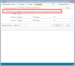 Para buscar [Texto de anotación] en Bibliotecas de red en las que se pueden realizar búsquedas de texto completo, vuelva al paso 6 y anule la selección de la casilla de verificación [Cuando efectúe una búsqueda, no utilice los índices creados para la búsqueda (podría verse ralentizada)].