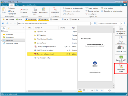 Si realiza una de las siguientes operaciones sin seleccionar un documento, la Carpeta de destino del documento se selecciona en la Ventana de navegación, y puede consultar las carpetas y documentos en la Carpeta de destino del documento en la Ventana de visualización de la lista de archivos.
