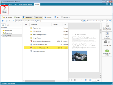 Las páginas que van a exportarse a una Carpeta de Windows solo pueden seleccionarse en la Ventana de vista preliminar para documentos PDF.