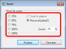 Puede especificar un factor de ampliación en unidades del 1 %. Si introduce un valor mayor que el límite superior (200 %) o menor que el límite inferior (5 %), las páginas aparecen automáticamente con el factor de ampliación disponible más cercano al valor especificado. Si se introduce un número con un separador decimal, el número cambia automáticamente al valor establecido previamente.
