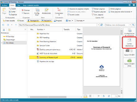 Puede convertir documentos registrados en la biblioteca en documentos PDF y adjuntarlos a un correo electrónico.