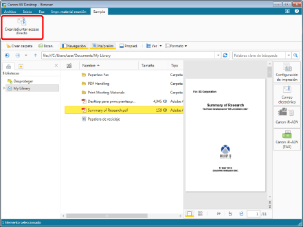 Puede convertir documentos registrados en la biblioteca en documentos PDF y adjuntarlos a un correo electrónico. Para obtener más información, consulte: