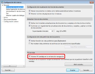 [Configuración del sistema] > [Browser] > [Opciones de visualización] > [Mostrar Mi bandeja en la ventana de navegación]
