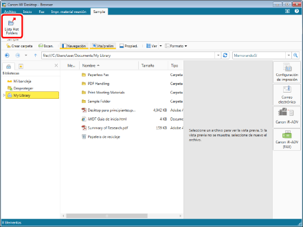Si desea seleccionar una carpeta en una Biblioteca de Document Server o Biblioteca de SharePoint Server, seleccione una carpeta para la cual disponga de privilegios de edición o superiores.