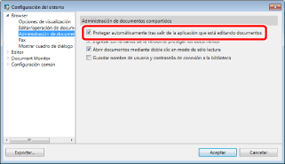 [Configuración del sistema] > [Browser] > [Administración de documentos compartidos] > [Proteger automáticamente tras salir de la aplicación que está editando documentos]