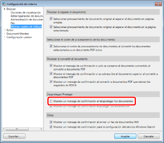 [Configuración del sistema] > [Browser] > [Mostrar cuadro de diálogo] > [Mostrar un mensaje de confirmación al desproteger los documentos]