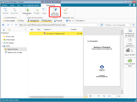 Los elementos de una Biblioteca de Document Server, Biblioteca de SharePoint Server o Biblioteca de Therefore se muestran en la Ventana de visualización de la lista de archivos.