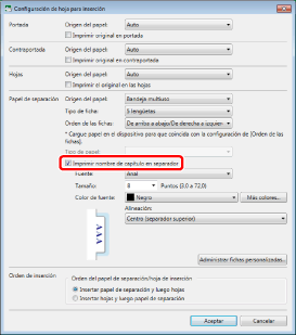 Haga coincidir el orden del papel de separación cargado en el dispositivo con los ajustes de [Orden de las fichas]. Si el orden no es correcto, no se imprimirán en los separadores los nombres de capítulo.
