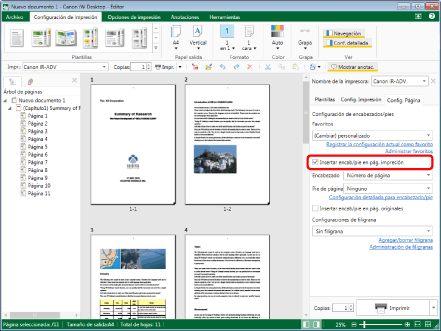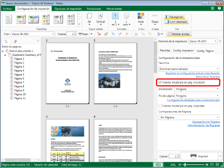 Haga clic en [Aplicar] para revisar la vista preliminar del documento en la Ventana de trabajo sin cerrar la [Configuración detallada de encabezados/pies (páginas de impresión)]/[Configuración detallada de encabezados/pies (páginas originales)].