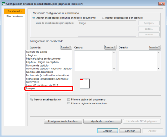 Se puede establecer una imagen para cada posición de inserción del encabezado o pie de página.