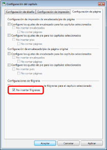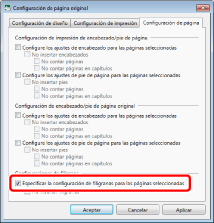 Seleccione la casilla de verificación [Especificar la configuración de filigranas para las páginas seleccionadas] en [Configuraciones de filigrana] en la pestaña [Configuración de página].