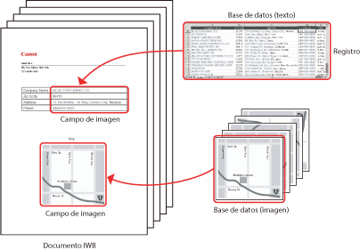 Un área reemplazable de la página se llama "campo de Combinación de correspondencia" y se puede establecer para texto reemplazable ("campo de texto") o imágenes reemplazables ("campo de imagen"). Los ajustes de los campos de Combinación de correspondencia se especifican en el Modo de ajuste de impresión de Combinación de correspondencia de Desktop Editor. Para guardar los ajustes de impresión de Combinación de correspondencia de un documento, guarde el documento en el formato IWB (*.iwb).