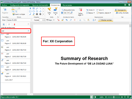Al seleccionar las anotaciones de la pestaña [Lista de anotaciones], se seleccionarán las anotaciones de la Ventana de trabajo. Sin embargo, si selecciona una anotación de una página distinta de la que está seleccionada actualmente, la Ventana de trabajo cambia a la página en la que se seleccionó dicha anotación.
