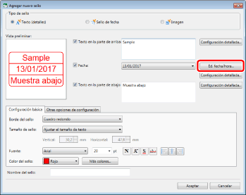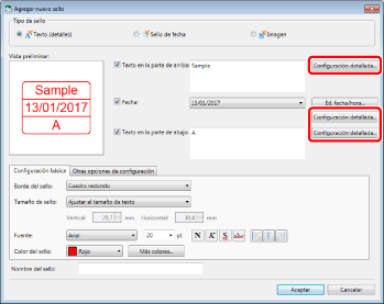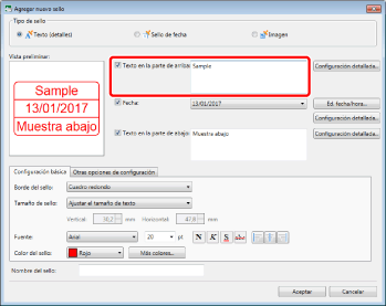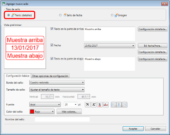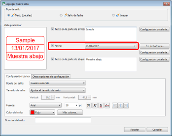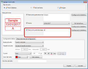 El tamaño de fuente no se podrá cambiar cuando se haya seleccionado [Especificar un valor (mm)] en [Tamaño de sello] en la pestaña [Configuración básica] de [Agregar nuevo sello].