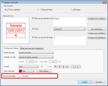 Si no introduce un nombre en [Nombre del sello], se establecerá automáticamente un nombre extraído del texto introducido en [Texto en la parte de arriba]/[Texto en la parte de abajo].