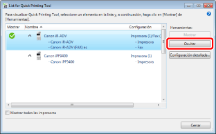 También puede hacer clic con el botón derecho del ratón en Quick Printing Tool y seleccionar [Ocultar] para realizar la misma operación.