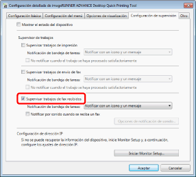 Solo se puede monitorizar la recepción de faxes que hayan recuperado su información en Quick Printing Tool.