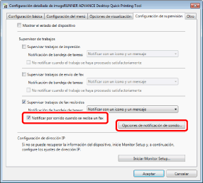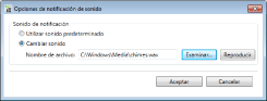 Si selecciona [Cambiar sonido], el archivo de sonido especificado para [Nombre de archivo] se configura como sonido de notificación. En [Nombre de archivo], puede especificar el archivo de sonido en formato wav/wave preferido para el sonido de notificación haciendo clic en [Examinar].