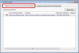 Para guardar el registro en [Registro de documentos de carpeta monitoreada], seleccione la casilla [Dejar registro de documentos de carpetas monitoreadas] en el menú [Archivo] > [Opción] > [Configuración del sistema] > [Document Monitor] > [Configuración de carpeta monitoreada].