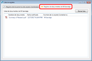 Para guardar el registro en [Registro de documentos de Mi bandeja], seleccione la casilla [Dejar registro de documentos para Mi bandeja] en el menú [Archivo] > [Opción] > [Configuración del sistema] > [Document Monitor] > [Configuración de Mi bandeja].