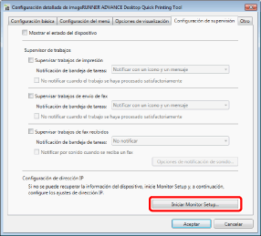 Si Desktop Monitor Setup se está ejecutando, no cambie los ajustes del dispositivo desde la pantalla de propiedades de la impresora de Windows. Si lo hace, será necesario reiniciar Desktop Monitor Setup.