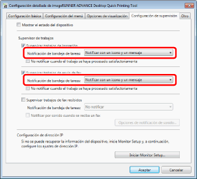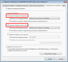 Si se envía un trabajo de impresión a un dispositivo con [Retención forzada] establecida, se cancela la monitorización de trabajos cuando Printer Monitor confirma los ajustes del dispositivo. Por lo tanto, la notificación de finalización no se enviará.