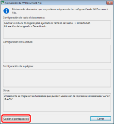 Si desea volver a especificar los ajustes de impresión, es conveniente que copie y pegue el contenido de [Conversión de iW Document File] en un archivo de texto.