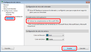 Haga clic en [Configuración común] > marque la casilla [Activar los complementos en Microsoft Office] en [Preferencias] y haga clic en [Aceptar].