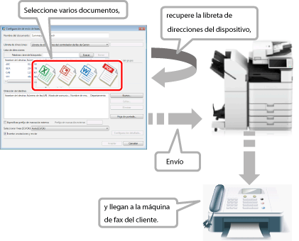 Para enviar varios documentos como un único documento, establezca [Combinar documentos seleccionados en un documento con Editor para enviar un fax] en los ajustes del botón de salida de fax. Para obtener más información sobre cómo configurar estos ajustes, consulte el siguiente apartado.